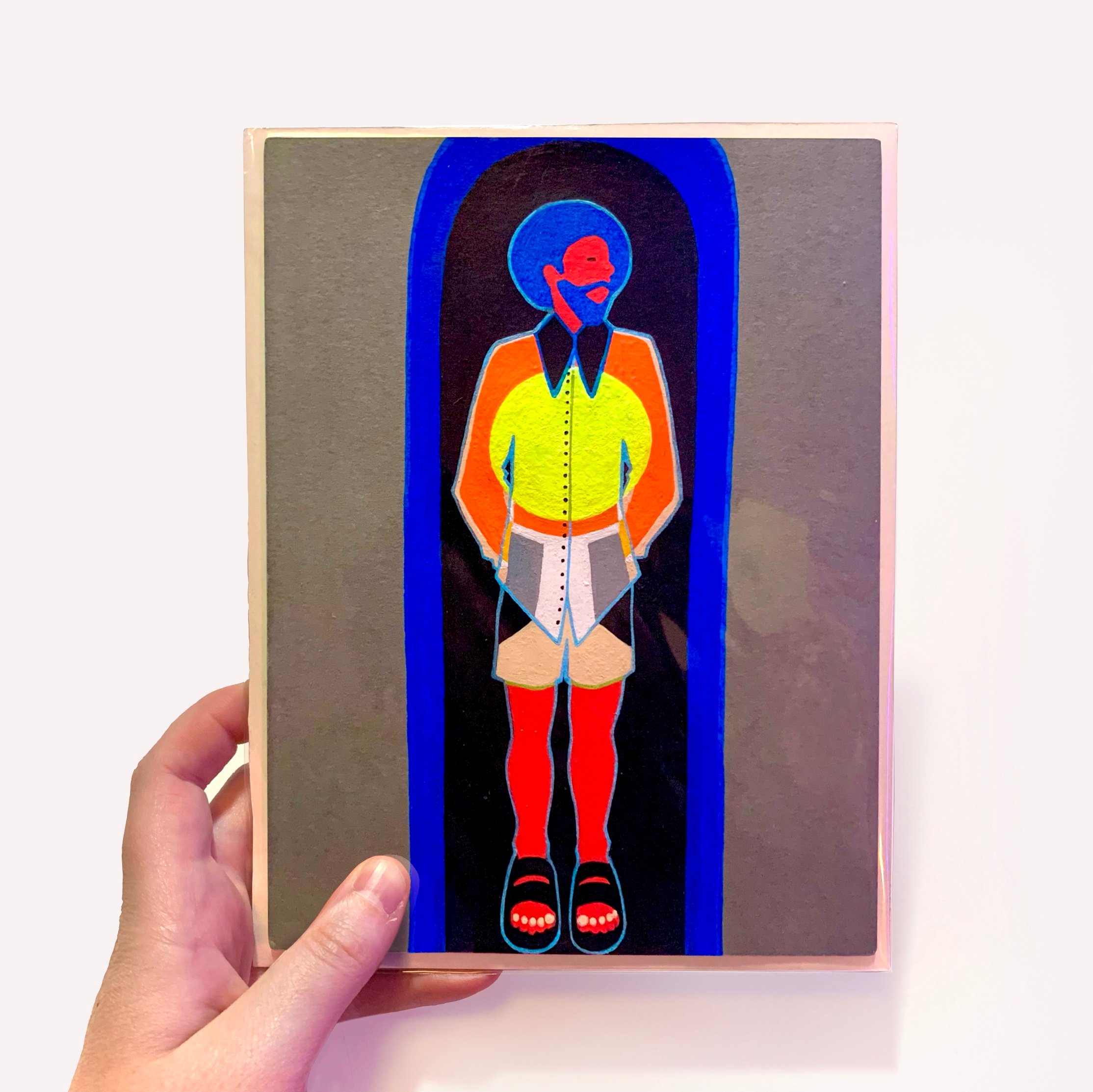 Packaged in a clear sleeve with chipboard backing and a handwritten artwork tag.