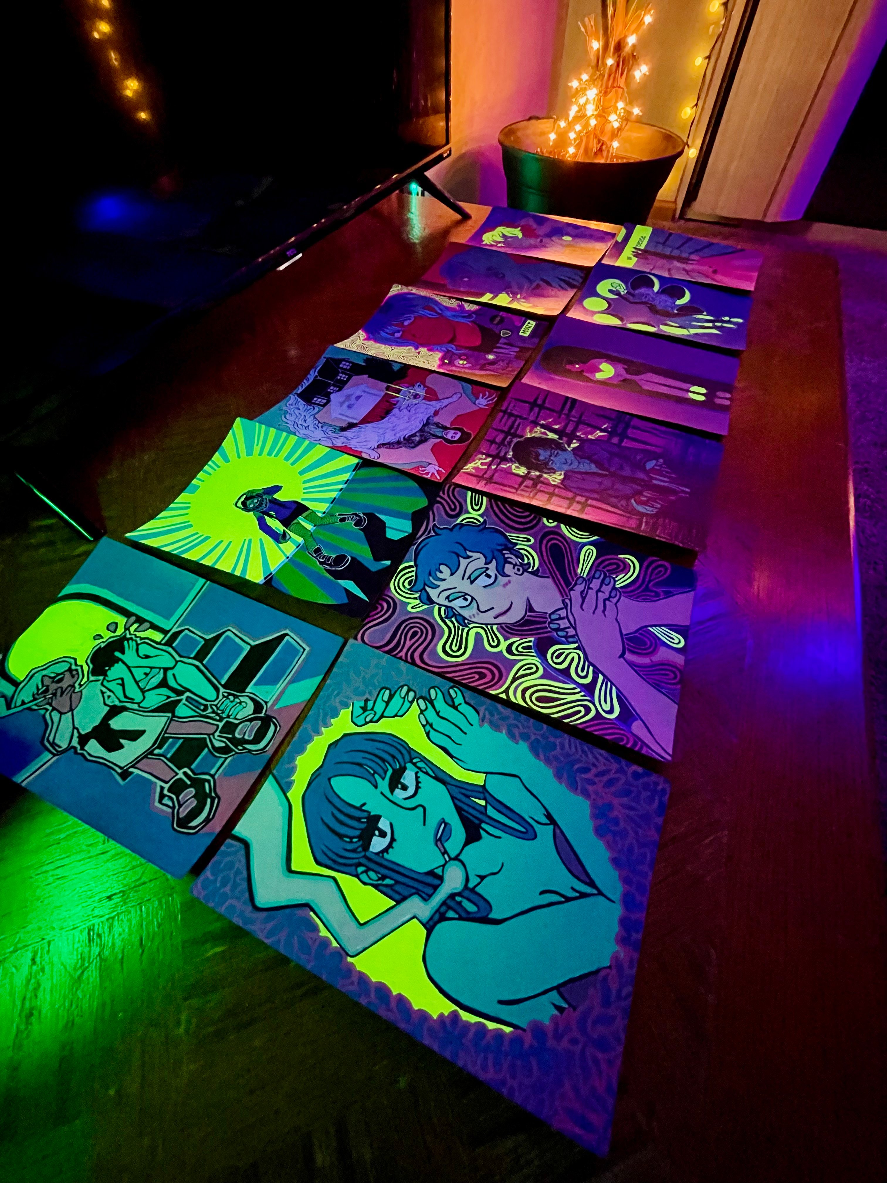 Original illustration from my 2021 Sketchbook collection. Each piece in this set has neon highlights incorporated, which will glow under black light!